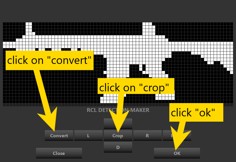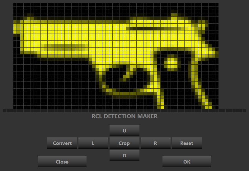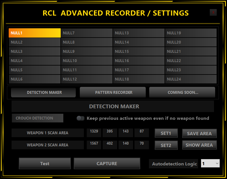Select the game profile (as shown above )then click on detect maker to open up the RCL Auto detection maker for that profile, It will show 24 recoil slots which you added in the settings (you can change the weapon recoil names in the settings ), Select one weapon and click on capture, it will bring a small square capture area, place that capture area on any part of the screen and double click right mouse button to capture. After capturing it will show a new interface with capture image , click on convert, then click on crop , then click ok to save it . Its that simple to make autodetection with RCL detection maker