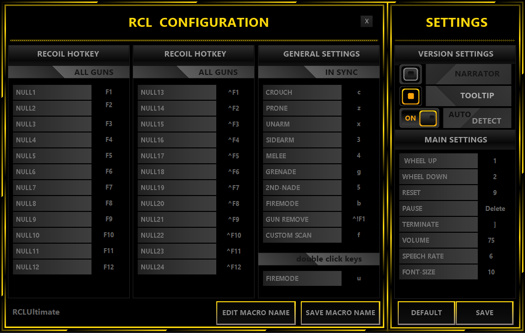 24 recoil macro per each game profile ( upto 10 game profile . So you can add up to 10 different games with 24 guns simultaneously) , you can edit weapon name and this name will be shown as feedback on screen or narrator will speak this weapon name when you enable recoil for that weapon.