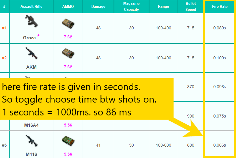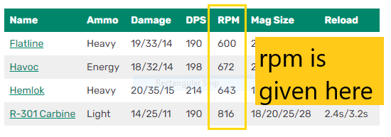search for weapon stats for the game in google, and open any website that have “rate of fire” or “rpm” for the weapons. here are some example below