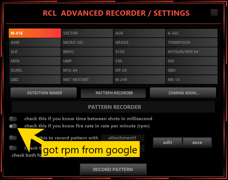 If you found RPM as rate of fire , toggle fire rate in rate per minute button in RCL pattern recorder interface.
