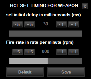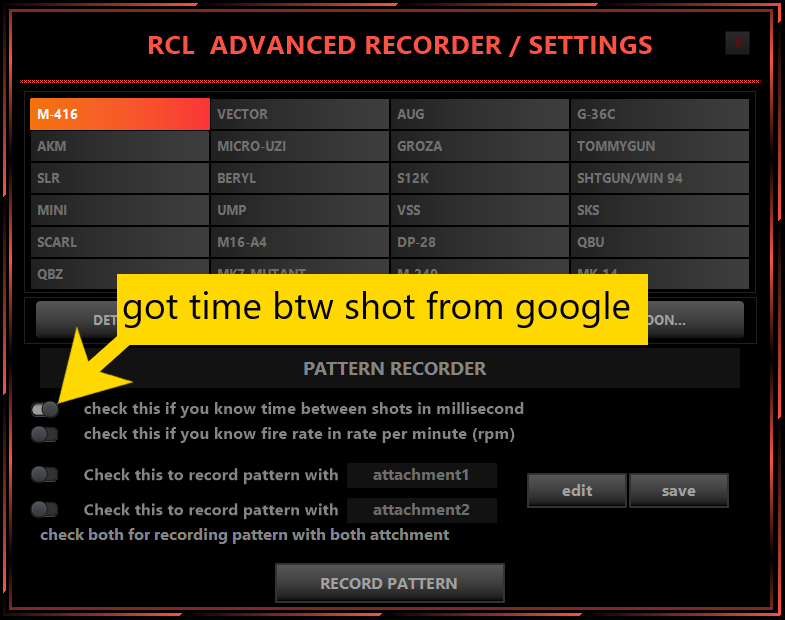 if you found the time between shots in seconds , toggle time btw shots button in RCL pattern recorder interface.